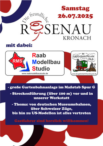 Am 26.07.2025 sind alle Modellbau- und Modelleisenbahn-Freunde herzlich zum "Rosenaufest" in unsere Räumlichkeiten in der Rosenau 4b, 96317 Kronach eingeladen!